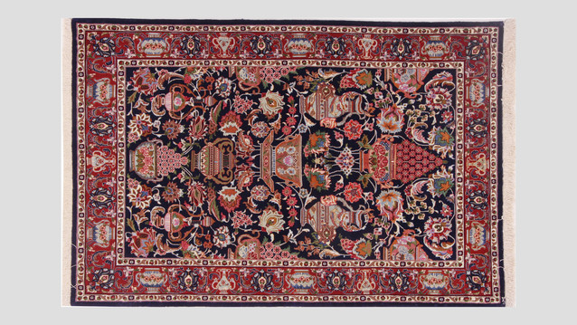 Aus einem Wallfahrtsort stammend, waren traditionelle Ghom häufig Gebetsteppiche. Die Feinheit der Knüpfung und die künstlerische Raffinesse der Muster machen den Ghom zu einem der edelsten Perserteppiche. Um Kontraste hervorzuheben, wurde bei diesem Teppich an den Motivrändern Seide eingearbeitet.